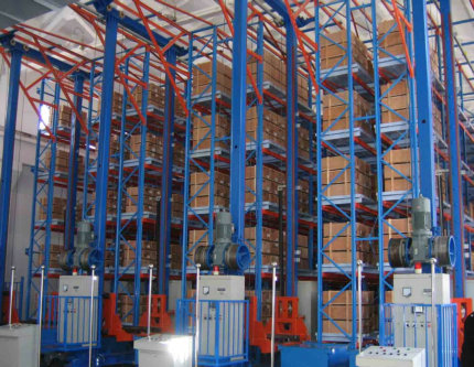 采用立體貨架和堆垛機(jī)等設(shè)備,使堆垛機(jī)在立體貨架之間的巷道沿水平和豎直方向行走,根據(jù)計(jì)算機(jī)的指令將以托盤(pán)承載的貨物通過(guò)電機(jī)驅(qū)動(dòng)的貨叉存入指定的貨位,或從指定貨位將貨物取出。